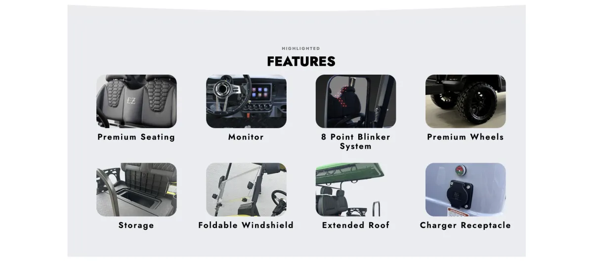 Everything you see listed! Apple CarPlay, wireless charging, premium sound system, LED lights, disc brakes, and all safety features are standard. No hidden costs or required upgrades - this is our closeout pricing on fully-loaded carts.