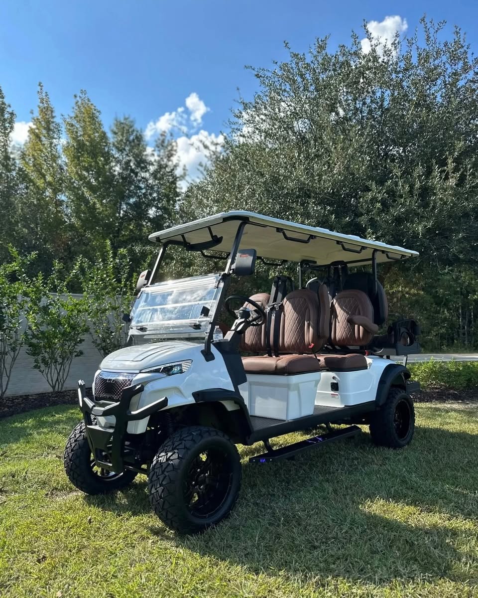These carts can travel up to 25 MPH and include required safety features like headlights, turn signals, and mirrors. Street legality varies by city and county in Florida. We'll help you understand your local regulations and what modifications may be needed.